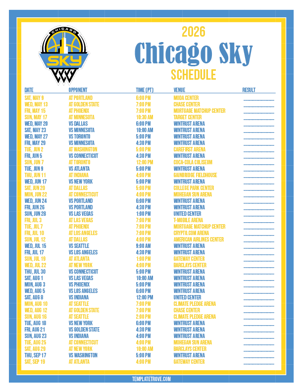Keep up with the Chicago Sky basketball team in the 2026 season with our free printable regular season schedules.