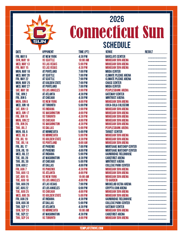 Keep up with the Connecticut Sun basketball team in the 2026 season with our free printable regular season schedules.