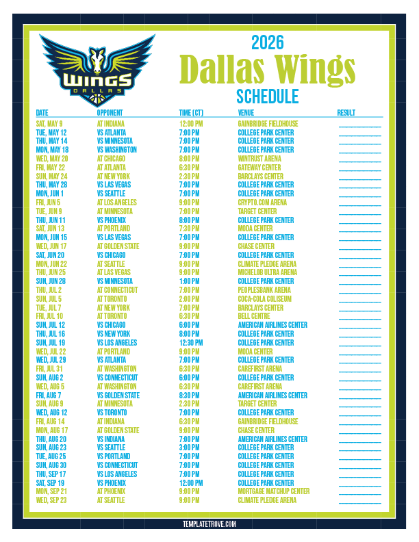 Keep up with the Dallas Wings basketball team in the 2026 season with our free printable regular season schedules.