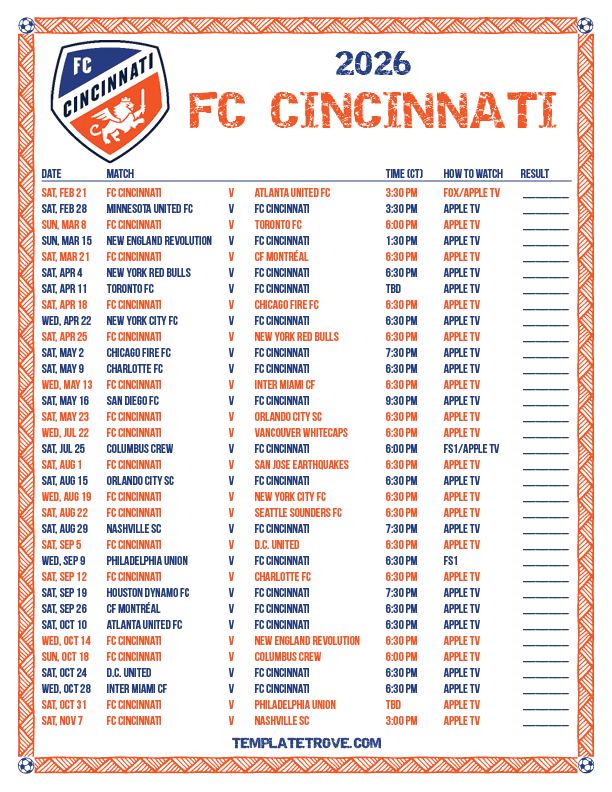Hey awesome FC Cincinnati soccer fans! Let's make sure our orange and blue spirit is felt all around by sharing those fantastic printable schedules with our fellow fanatics! Click those share buttons on the right if you're on desktop or tap the vibrant black share button at the bottom right on mobile – it's that easy!