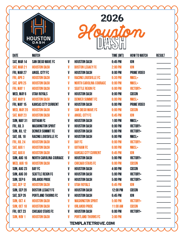 Keep up with the Houston Dash soccer team in the 2026 season with our free printable regular season NWSL schedules.