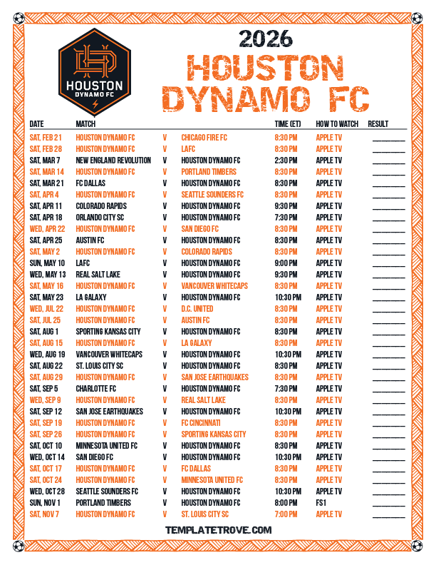 Keep up with the Houston Dynamo FC soccer team in the 2026 season with our free printable regular season schedules.