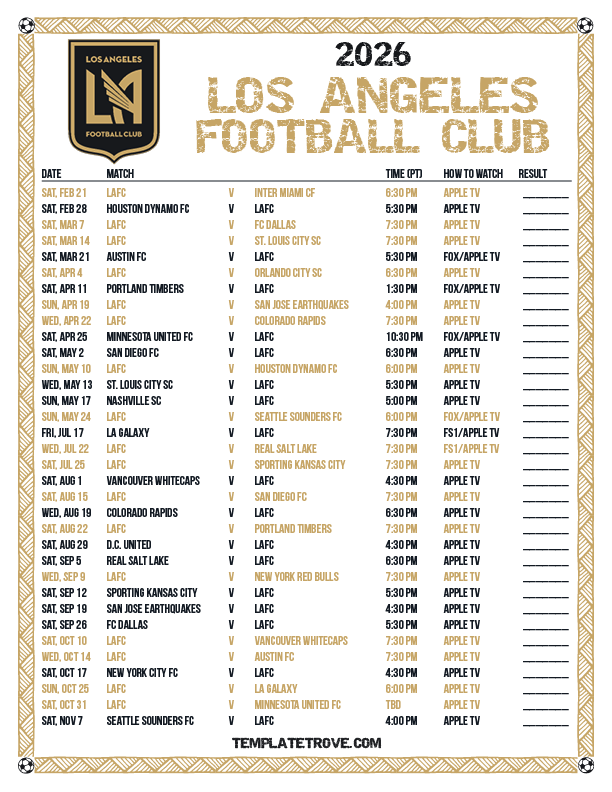 Keep up with the Los Angeles Football Club soccer team in the 2026 season with our free printable regular season schedules.