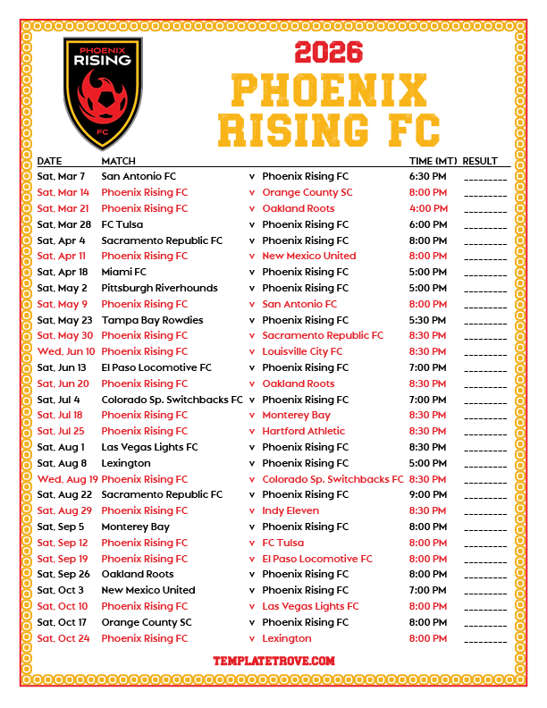 Keep up with the Phoenix Rising FC soccer team in the 2026 season with our free printable regular season schedules.