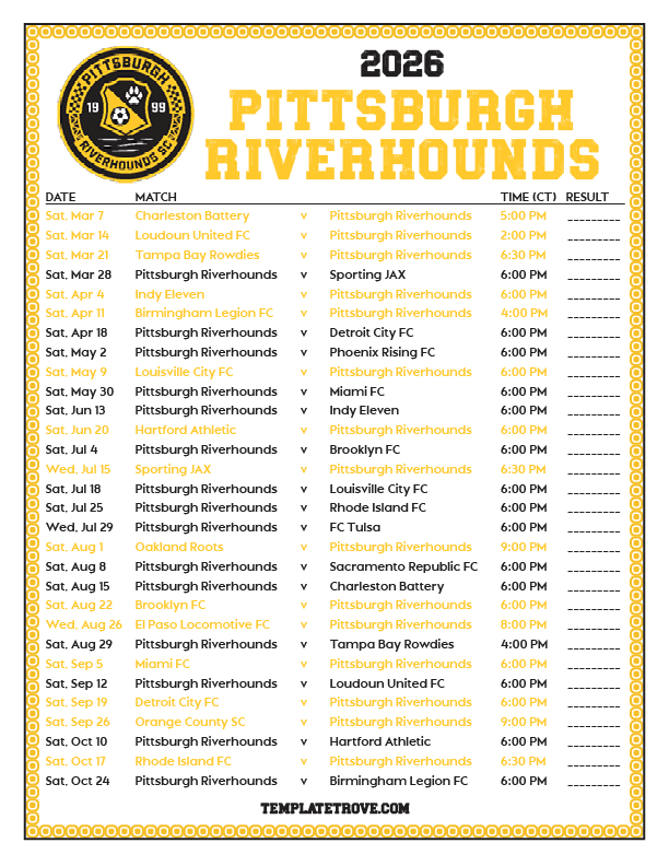 Keep up with the Pittsburgh Riverhounds soccer team in the 2026 season with our free printable regular season schedules.