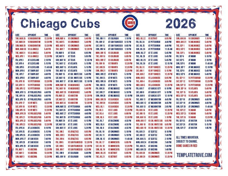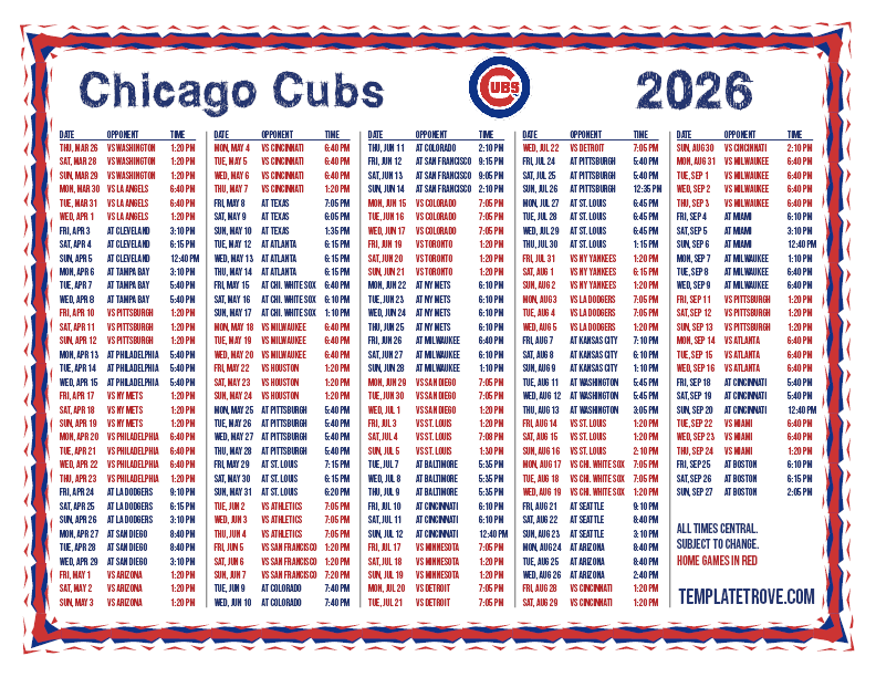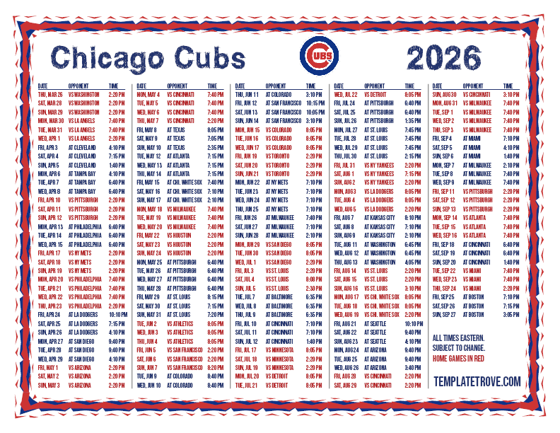 Keep up with the 2026 Chicago Cubs with our handy printable schedules, now available for each US time zone.