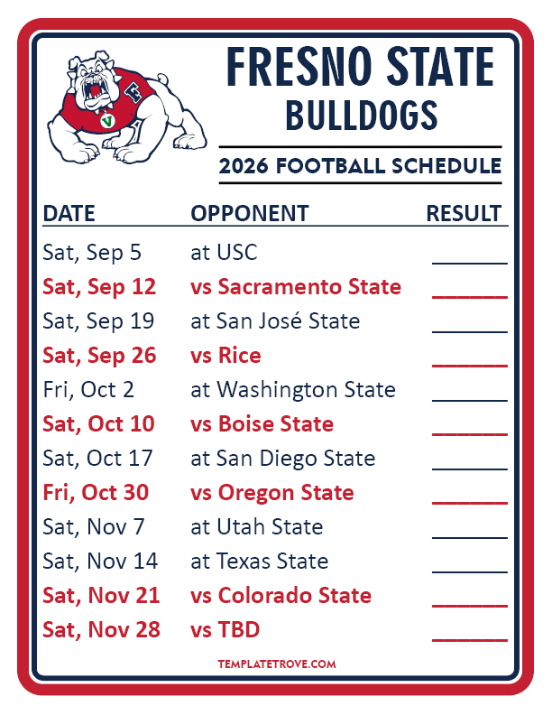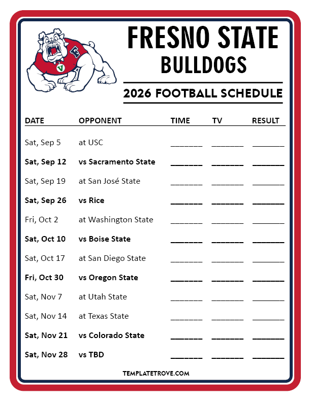 Style 3 - dates and opponents with columns to write in game times, TV network and results