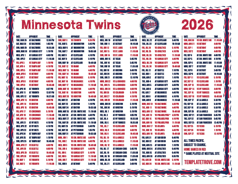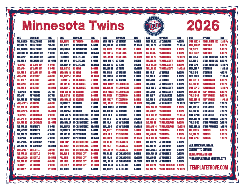 Keep up with the 2026 Minnesota Twins with our handy printable schedules, now available for each US time zone.